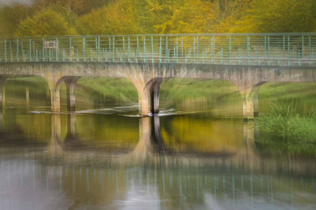 Changement de décor et de technique : Un « dézooming »(*) m’ a permis d’accentuer le contraste entre l’immobilité du fleuve et le mouvement de l’eau autour des piliers du pont.